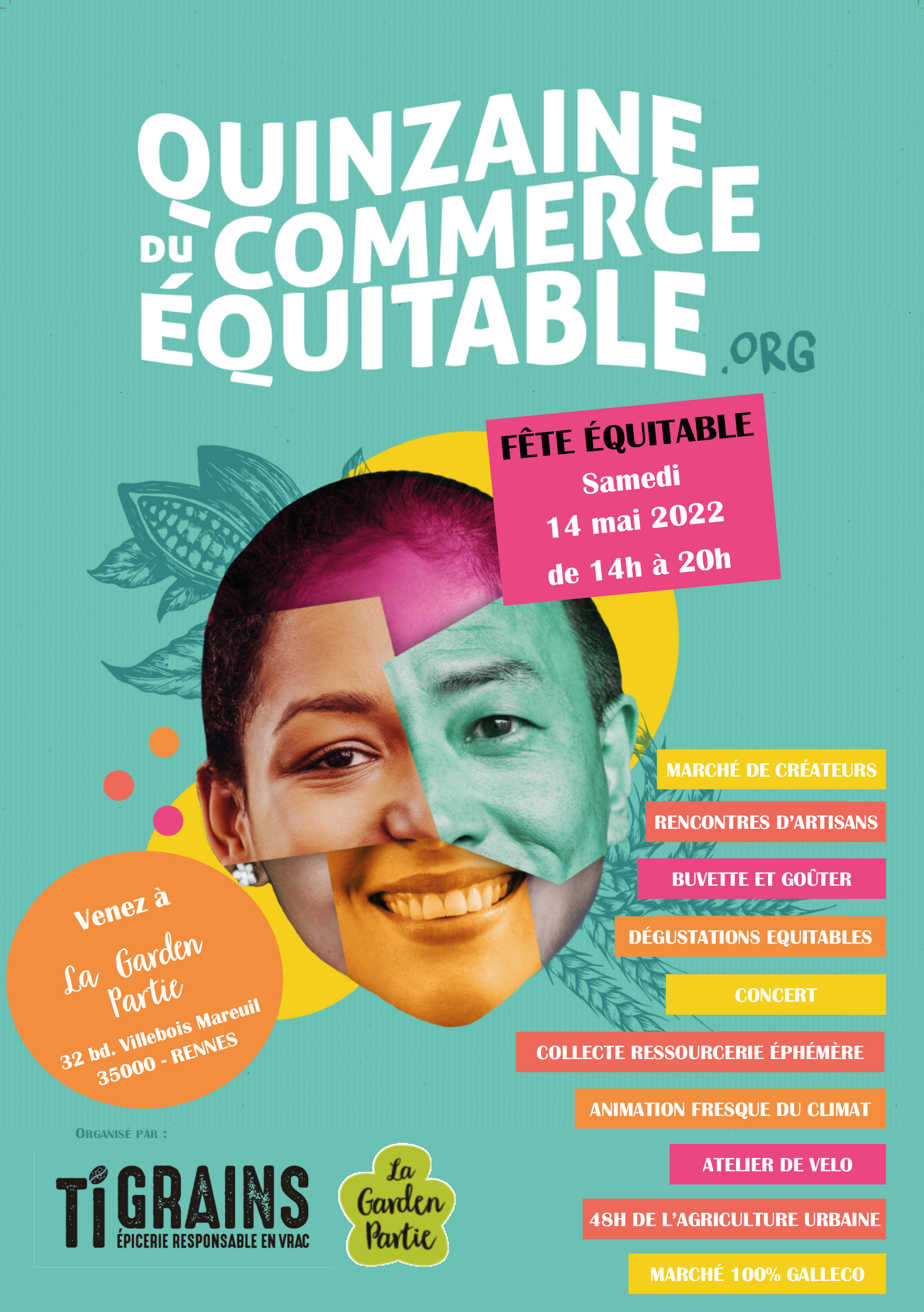 Samedi 14 mai 2022, à partir de 14h les rennais sont conviés à la fête équitable, pour se rappeler que d’un bout à l’autre de la planète, des liens invisibles nous relient à celles et ceux qui nous nourrissent et qui fabriquent nos produits du quotidien.