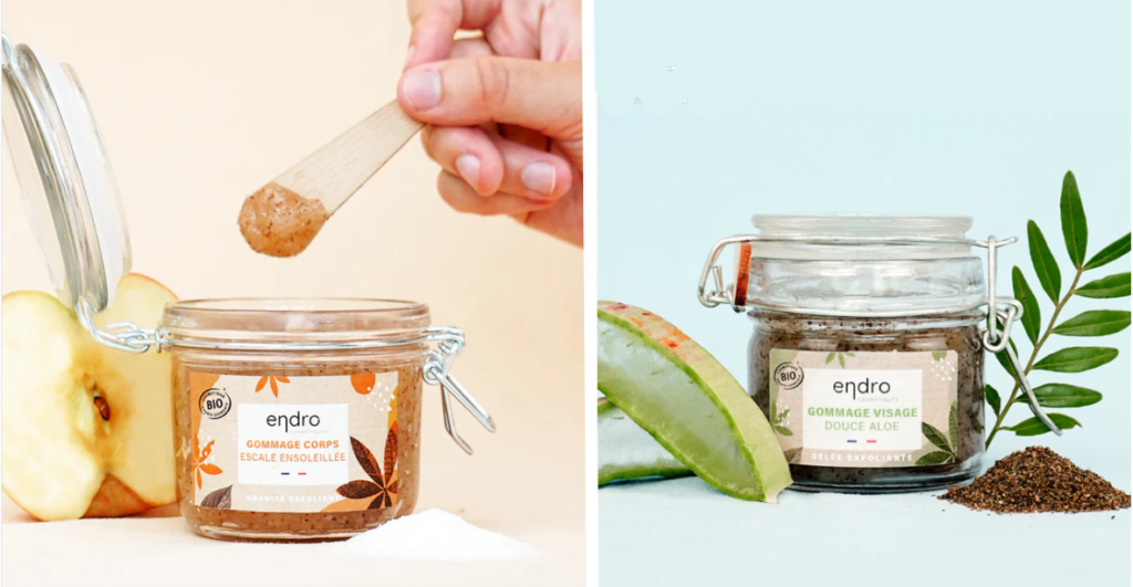 Sinon vous pouvez aussi utiliser les délicieux gommages visage et corps de Endro, en mode antigaspi, ils réutilisent entre autre de la poudre de coque de graines de chanvre, du gel d’aloevera, du marc de pomme et du sucre de betterave, miam !